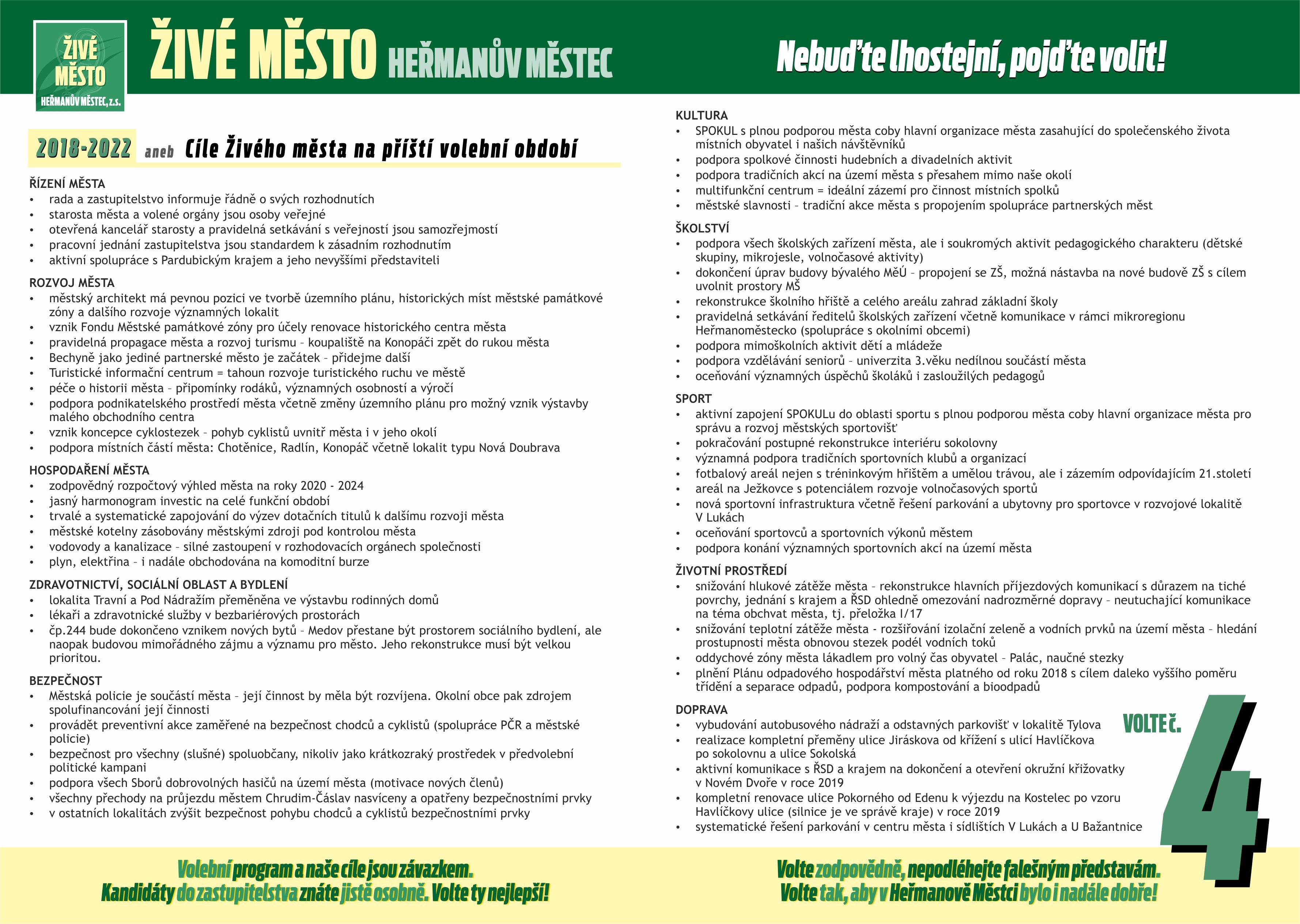 Volební pátek a sobota 5.-6.října 2018 se nezadržitelně blíží. Věříme, že máme čím městu přispět. Naše cíle jsou součástí letáků, které zamířily do každé domácnosti v našem městě. Děkujeme za podporu nejen v čase předvolebním, ale i za samotnou volbu naší kandidátky. Volte č.4, vyberte celou kandidátku Živého města a my uděláme vše proto, abyste své volby nelitovali, ať už naše role bude v povolebním sčítání jakákoliv.