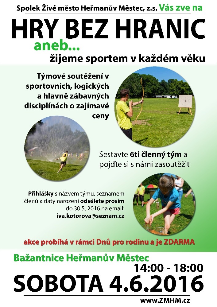 V rámci akce DNY PRO RODINU Vás opět srdečně zveme 4. 6. 2016 do Bažantnice v Heřmanově Městci od 14 hodin na týmové soutěžení ve sportovních, logických, ale hlavně zábavných disciplínách o zajímavé ceny!