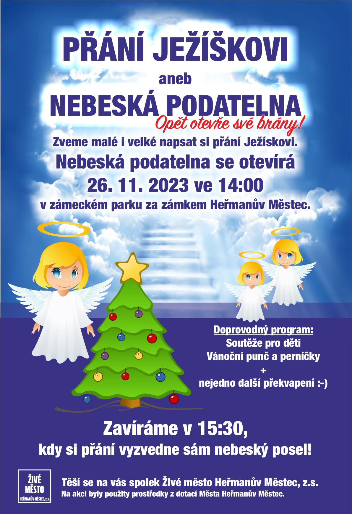 Poslední listopadová neděle je dnem, kdy k nám do zámeckého parku zavítá Nebeský posel. Zveme všechny, malé i velké, přijďte si poslat svá přání Ježíškovi.