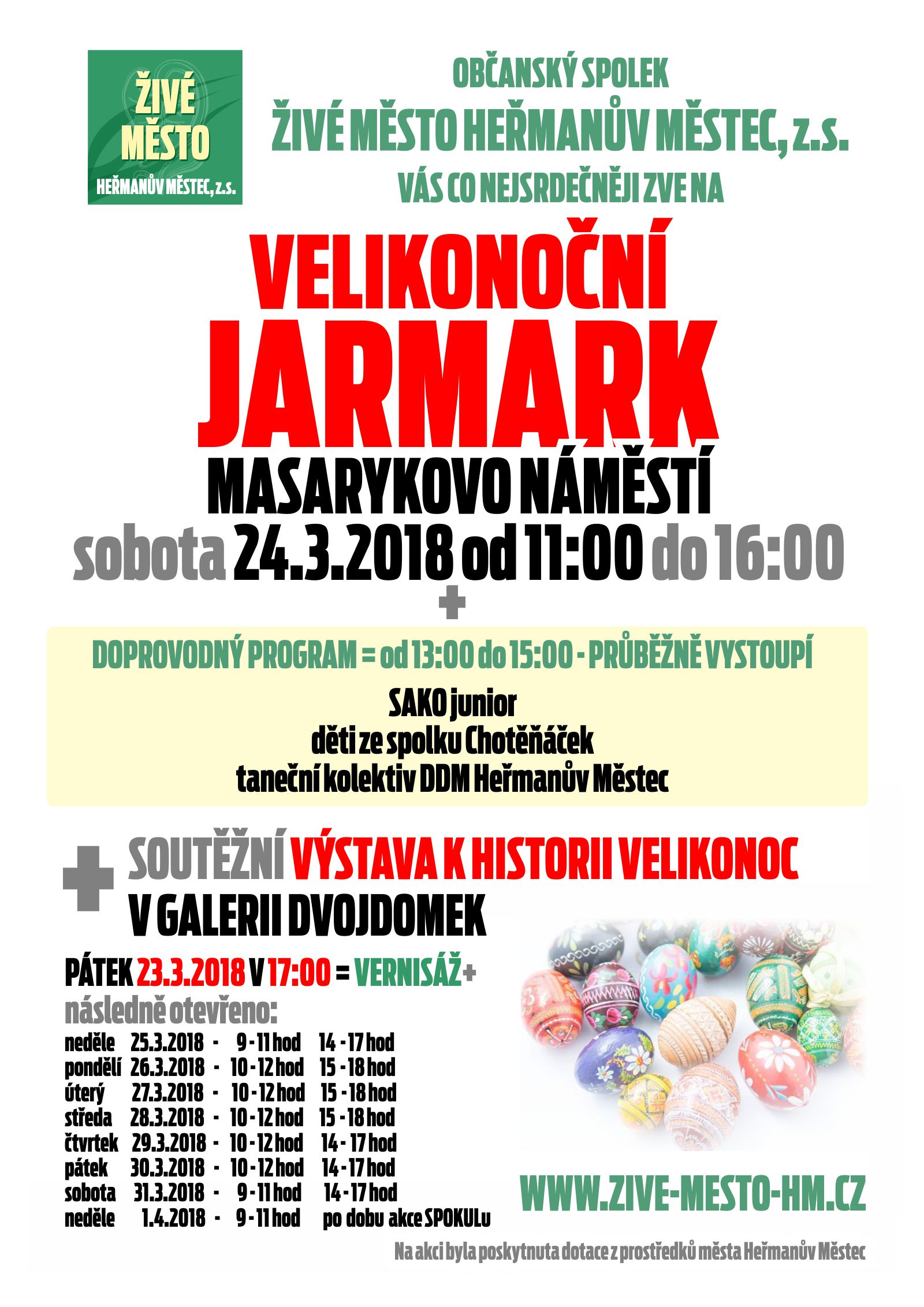 Masarykovo náměstí opět ožije trhovci, hudebními a tanečními vystoupeními. Pojďme vítat jaro - VELIKONOČNÍ JARMARK je tady! Vše doplní i tradiční soutěžní výstava k historii velikonoc v Galerii dvojdomek (vernisáž předvečer jarmarku, tj. pátek 23.3. v 17:00).