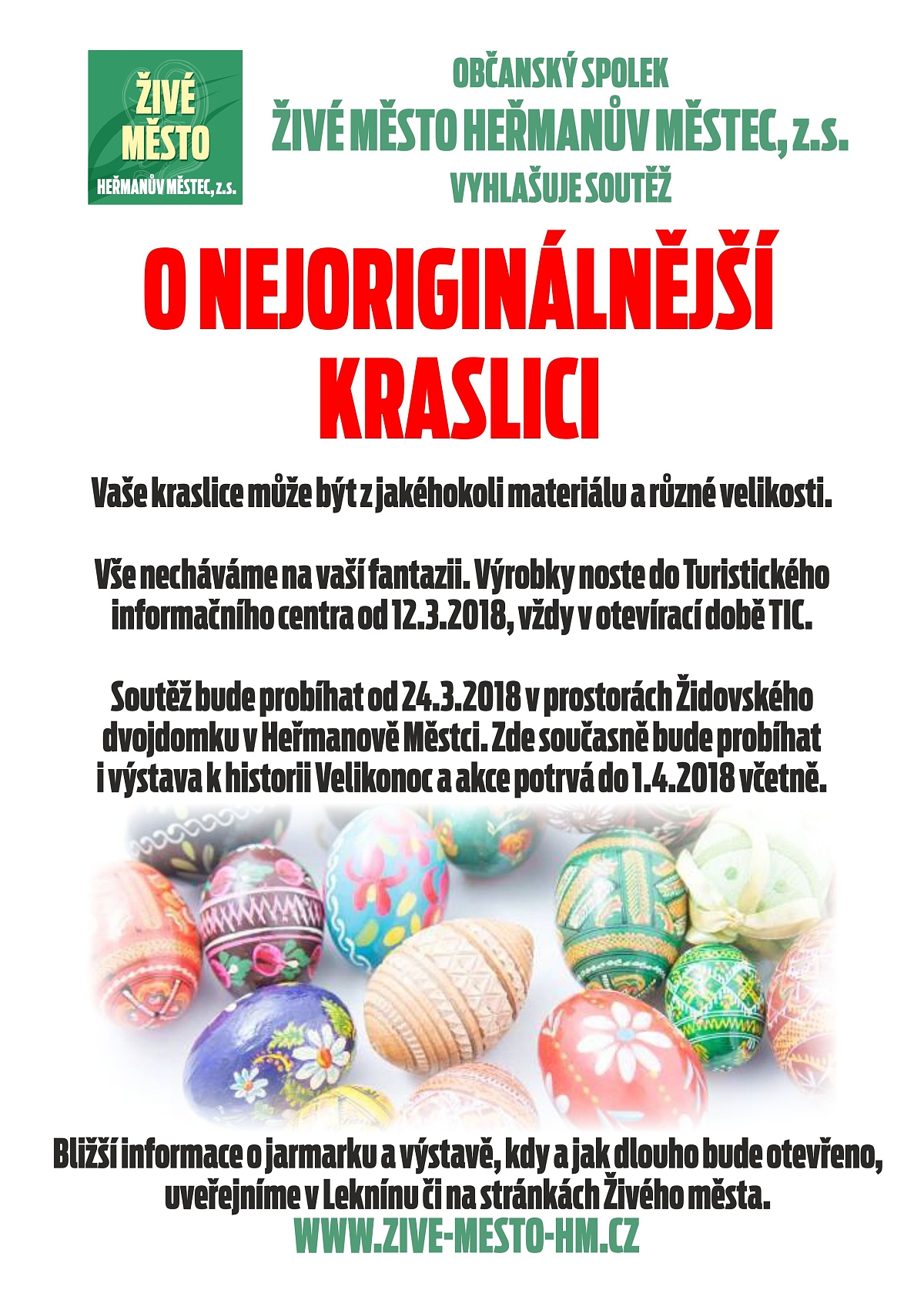 Jaro vždy zahajujeme symbolicky akcí zvanou VELIKONOČNÍ JARMARK. A vždy ji i doplňujeme o soutěž pro širokou veřejnost. Nebude tomu ani jinak ani letos. Času je ještě dost, ale už teď se můžete připravovat na soutěž!