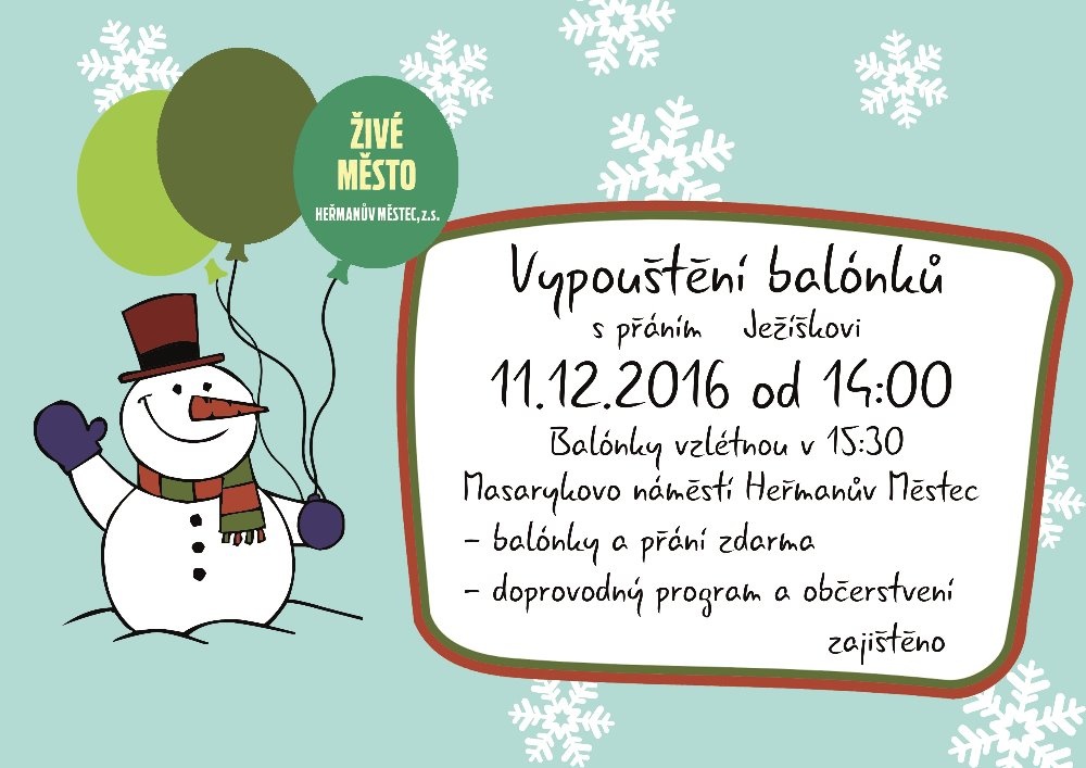 Sejdeme se opět na Masarykově náměstí a to v neděli 11.12.2016 - program začíná od 14:00 a samotný start balonků proběhne v 15:30. Přijďte na medovinu, jen tak poklábosit a se svými ratolestmi připravit balonky k letu. Přáníčka a balonky samotné máme pro vás jako každý rok připraveny zdarma. Stačí jen přijít!